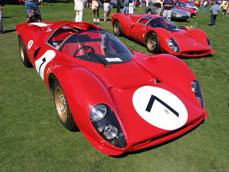 The beautiful Tipo 330 P4. THis car won the World Manufacturers Championship for sports cars in 1967 against stiff opposition from Porsche. Winning Daytona and Monza and placing second at Le Mans and Brands Hatch, it took second in the publicity department to Ford Mk IV's, which won at Sebring (uncontended) and Le Mans. Both cars were retired with FIA's new 3-liter limit on prototypes.